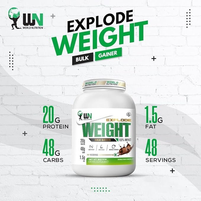 World Nutrition Explode Weight Bulk Gainer is a scientifically formulated, high-calorie muscle mass builder designed to help individuals gain healthy weight, improve muscle strength, and accelerate recovery. Each serving delivers 20 grams of high-quality protein to support lean muscle growth, along with 46 grams of carbohydrates for sustained energy and glycogen replenishment—perfect for those undergoing intense physical training or struggling with a fast metabolism. Infused with 5000 mg of BCAAs and Glutamine, it aids in rapid recovery, while 500 mg of Creatine Monohydrate enhances strength and performance during resistance training. The addition of 250 mg Taurine boosts stamina and muscle endurance, and a rich matrix of 13 essential vitamins and 6 minerals supports immune function, bone health, and metabolic efficiency. With just 12 grams of added sugar per serving, this clean gainer prioritizes quality calories over empty ones. It also features a 20 mg protein-digesting enzyme blend for improved absorption and gut comfort. Available in delicious flavors like Kesar Pista , this easy-to-mix gainer is suitable for both beginners and advanced fitness seekers, making it an excellent choice for anyone focused on healthy bulking, strength gains, and overall performance enhancement.